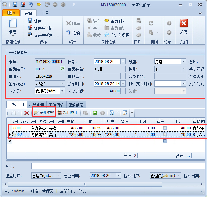 ①可以會員信息界面的菜單欄點擊“美容快修開單”快速為會員建立快修單,軟件會將會員信息自動帶出到快修單中,會員要消耗套餐,在“服務項目”中選擇使用套餐,并選擇套餐內相應的服務,保存,如圖: