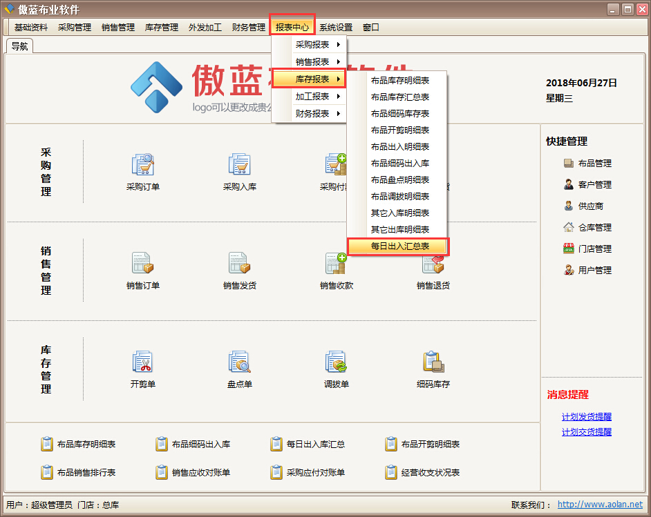 傲藍布行管理系統查詢每日出入庫匯總情況步驟: