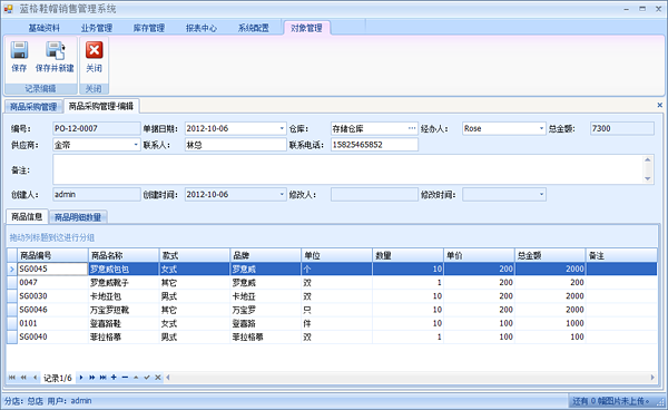 在上圖中點擊【新建】打開商品采購單編輯界面。填寫好采購單相關的信息。然后點擊【保存】這樣就把采購單錄入到系統中。當在上圖中選擇一個采購單點擊【編輯】,在該界面中會顯示選擇采購單詳細的信息,修改其中的項目,然后點擊【保存】,采購單的信息就更新完成。