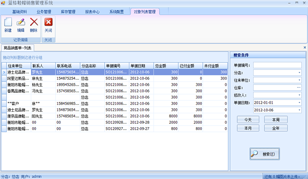 點擊【業務管理】->【銷售列表】, 打開銷售單據列表界面,該界面可以進行查詢,查詢相關銷售單的信息,雙擊該單據打開銷售詳細信息界面。銷售單據列表界面包括編輯銷售單,刪除單據和建立新的單據三個功能。如下圖: