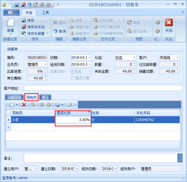 1、在銷售開單的同時,可以在銷售單上選擇相應的導購員,并設置業績提成比例,提成比例設置完成,系統將自動計算員工總的業績提成,如圖:
