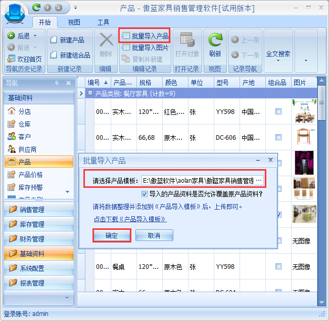 ④將修改好的家具產品資料信息導入到軟件中,點擊【批量導入產品】,選中修改后的①的產品信息表格,將產品資料導入至系統,如圖: