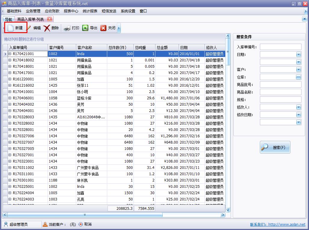 傲藍冷庫倉儲管理軟件,商品入庫功能,系統(tǒng)可分倉庫,按照商品批號管理,自動計算操作費用。系統(tǒng)采用冷藏費和操作費分離計算的方式。