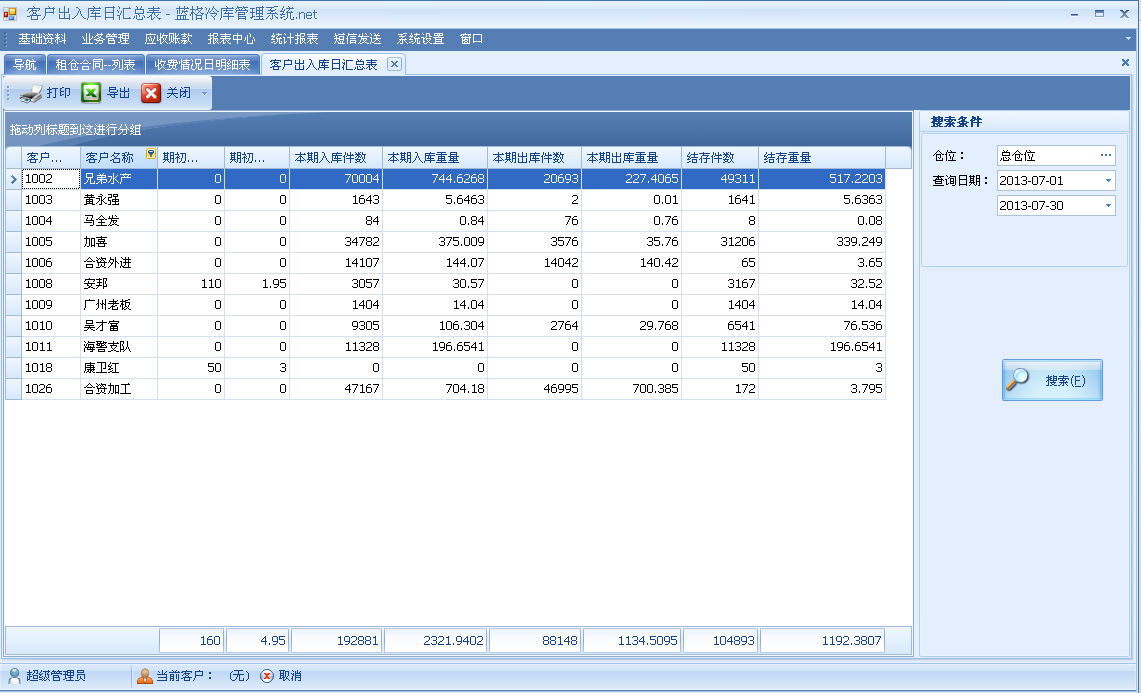 冷庫企業中,通常重視的是冷庫的營業收入情況和冷庫庫存量的變動,傲藍冷庫信息管理系統能滿足冷庫業務中需要的需求。例如明確的了解冷庫每天的收入情況 ,系統中的報表中心,有個“收費情況日明細報表”。