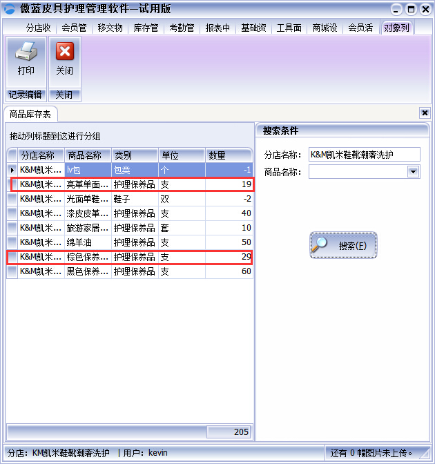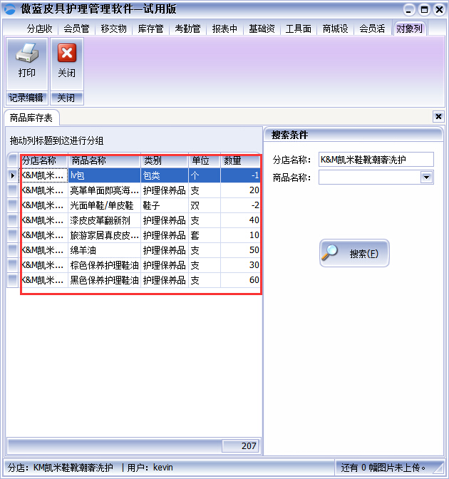 4、商品銷售完成之后,也可以查看商品庫存表,軟件會自動扣減相應(yīng)庫存數(shù)量;商品庫存表還支持打印,方便員工進(jìn)行商品盤點,進(jìn)行庫存管理,如圖: