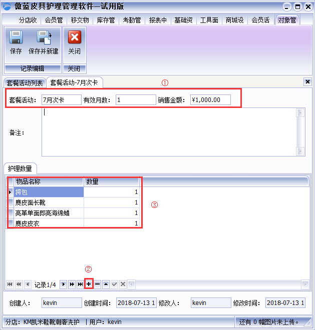 1、皮具護(hù)理店套餐活動(dòng)包括按次卡消費(fèi)、套裝消費(fèi)、月卡、年卡消費(fèi)。套餐活動(dòng)設(shè)置操作,點(diǎn)擊軟件【基礎(chǔ)資料】→【套餐活動(dòng)】→“新建”套餐活動(dòng),進(jìn)入套餐活動(dòng)建立頁面,填寫套餐活動(dòng)的詳細(xì)信息,包括活動(dòng)名稱、有效的月數(shù)、銷售金額,在皮具護(hù)理數(shù)量中點(diǎn)擊“+”添加套餐能可護(hù)理的物品名稱和數(shù)量,如圖:
