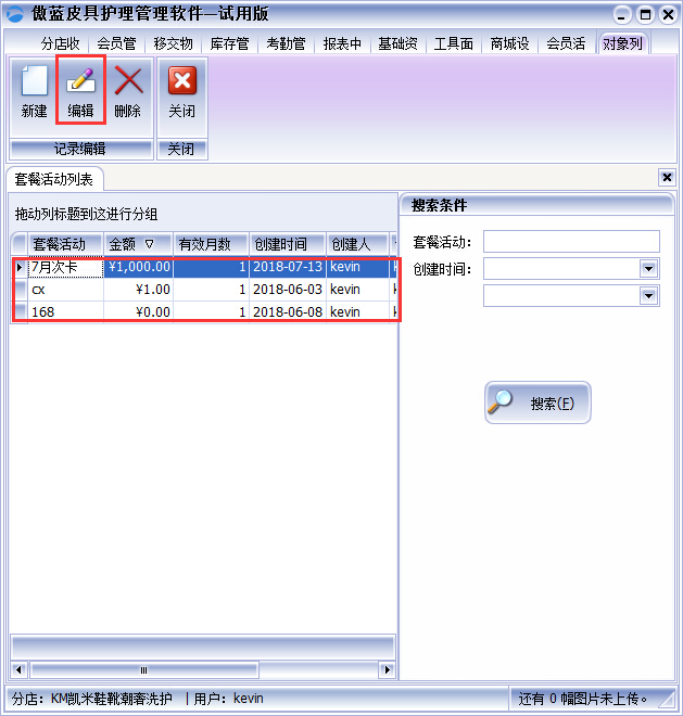 ①設(shè)置好的套餐活動(dòng)可以在套餐活動(dòng)類別中看到,如果某項(xiàng)套餐活動(dòng)需要修改可以在列表中選中套餐,點(diǎn)擊“編輯”即可進(jìn)行對(duì)該項(xiàng)套餐活動(dòng)進(jìn)行修改,如圖: