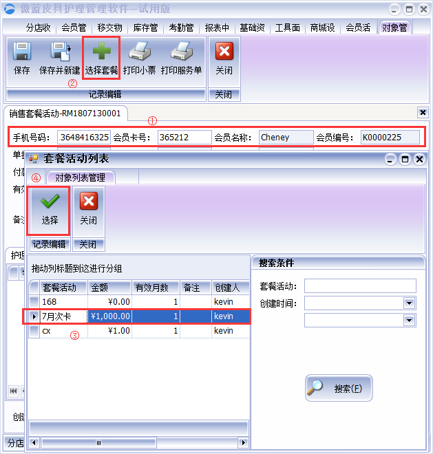 2、套餐首次銷售操作:傲藍(lán)皮具護(hù)理店管理系統(tǒng)套餐活動(dòng)基礎(chǔ)設(shè)置完成后,就可以在軟件中進(jìn)行套餐銷售開單了,點(diǎn)擊【會(huì)員管理】→找到【銷售套餐】可以為會(huì)員或散客建立套餐開單,填入會(huì)員或散客的信息,點(diǎn)擊菜單欄上的“選擇套餐”選擇客戶購買的套餐,點(diǎn)擊“選擇”即可,如圖:
