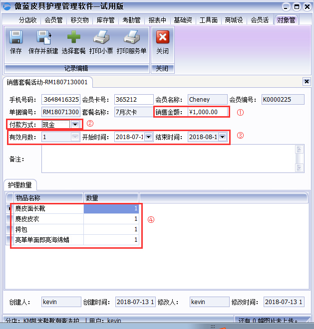 傲藍(lán)皮具護(hù)理店管理軟件護(hù)理套餐的自定義設(shè)置與套餐售出的具體操作步驟如下: