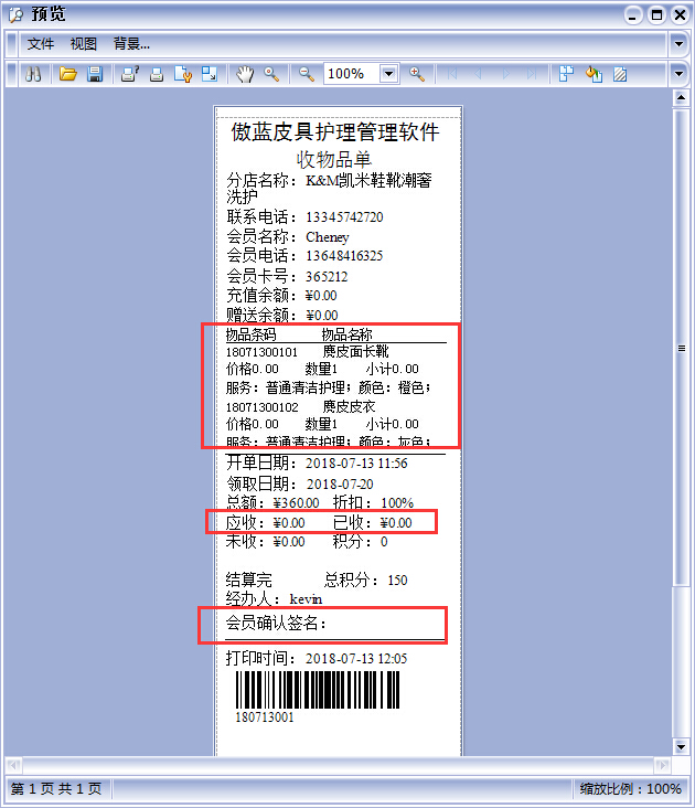 ②收物開單完成之后,點擊保存,打印收物開單小票給客戶簽字確認,如圖: