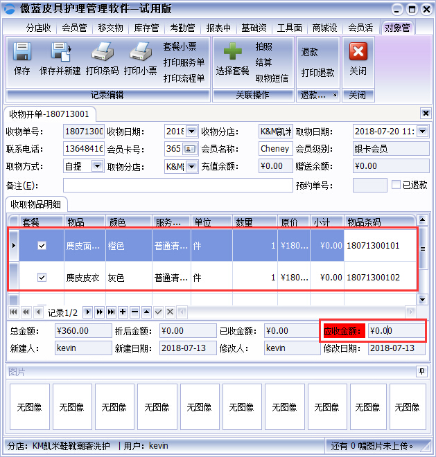 ①選擇套餐中的物品之后,可以在收物開單中再次確認本次清洗護理的物品是否有誤,軟件會自動在套餐中扣減套餐內的相應衣物數量,另外,還可以在單據中看到“應收金額為0”證明此次開單消費是屬于套餐消費,會員已付款。如圖:
