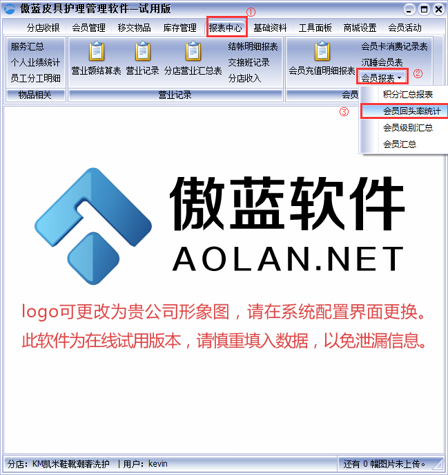 傲藍(lán)皮革養(yǎng)護(hù)店軟件中,會(huì)員回頭率統(tǒng)計(jì)報(bào)表非常實(shí)用,能及時(shí)統(tǒng)計(jì)會(huì)員回頭消費(fèi)的情況,如何在傲藍(lán)皮具修理中心管理軟件查看?如下為您介紹。