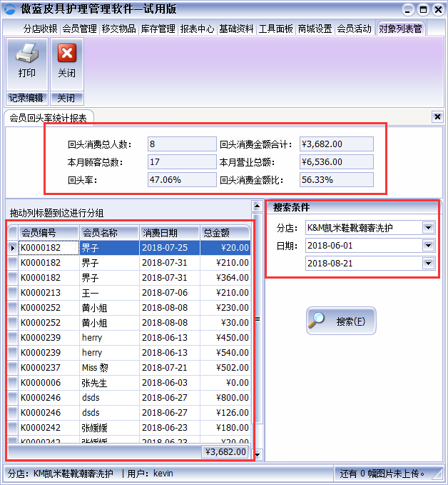 2、同時(shí)在皮革養(yǎng)護(hù)店軟件報(bào)表中的會(huì)員回頭率統(tǒng)計(jì)報(bào)表的右邊可以按分店、時(shí)間范圍進(jìn)行對(duì)每家分店的會(huì)員回頭率做出篩選。列表上部分別可以看到回頭消費(fèi)總?cè)藬?shù)、消費(fèi)金額、回頭率等等,如下圖: