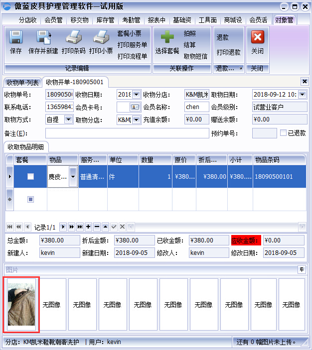 傲藍皮具修理店管理軟件支持拍照的圖片比一般圖片要大很多。一樣物品,需要不同角度拍照多幅圖片,以及多處護理的地方。于是傲藍皮具修理店管理軟件綜合考慮到干洗護理店的業務流程,設定支持可以拍照上傳多幅圖片,一般接近10幅。方便門店清洗護理師傅可以清楚快速展開工作,節約了時間也提高了門店各個職位員工的工作效率,這樣出錯率也會大大降低。所以傲藍皮具修理店管理系統是廣大皮具修理店得力的助手!