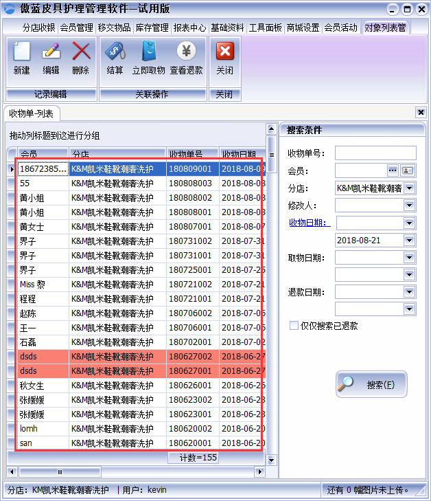 收物單是會自動保存當前登錄皮具護理店,在收物物單列表界面中可以搜索每個分店的收物單以及收物單信息,雙擊皮具護理店連鎖管理軟件選擇單據就可以打開該收物單查看到衣物明細來記錄。