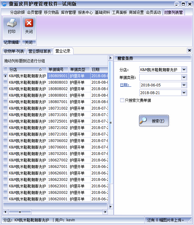 皮具護理店連鎖管理軟件在【報表中心】【營業記錄】表中可以根據分店搜索每個分店的單據付款信息。
