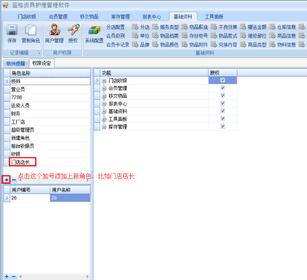 2、點擊角色名稱里的加號添加上門店員工的角色(員工職位),如下圖所示: