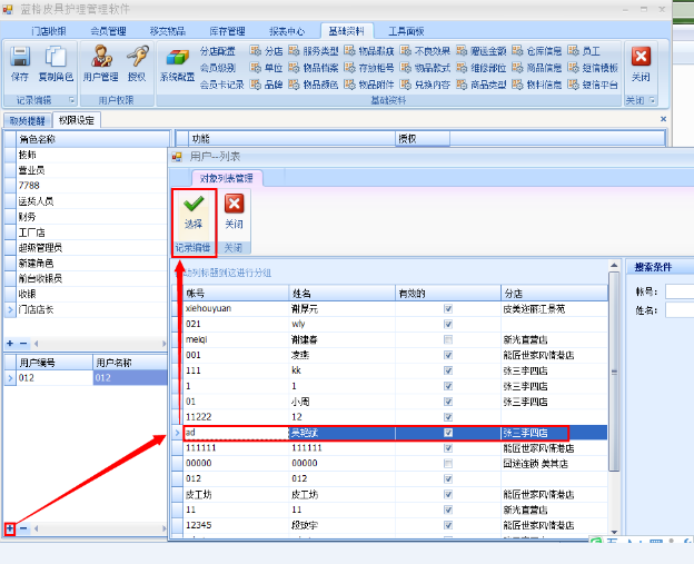 3、然后在用戶編號里面的加號里選擇該角色的員工,如下圖所示:
