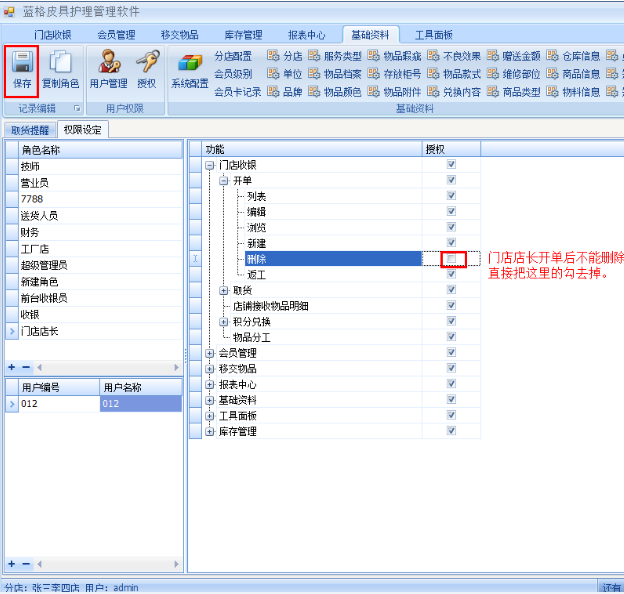4、在右邊的功能授權這里選擇相應的單據,分配權限,舉例,門店店長不允許開單刪除單據,操作如下: