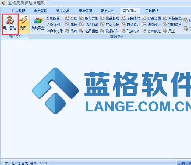 1、點(diǎn)擊皮具護(hù)理管理軟件導(dǎo)航上的基礎(chǔ)資料,再點(diǎn)擊“用戶管理”按鈕。如下圖: