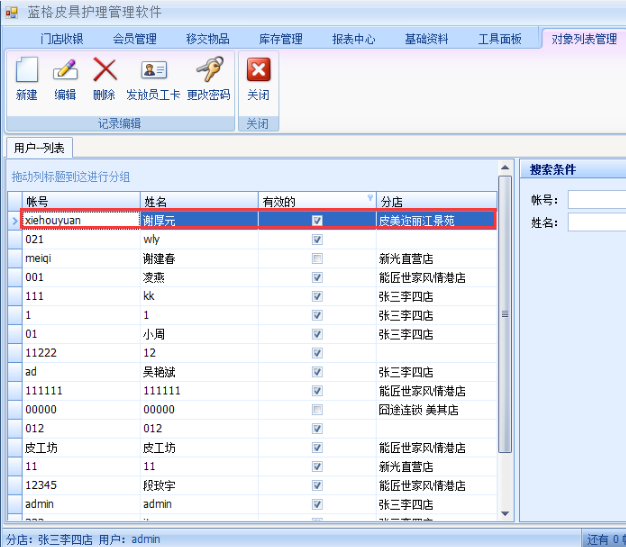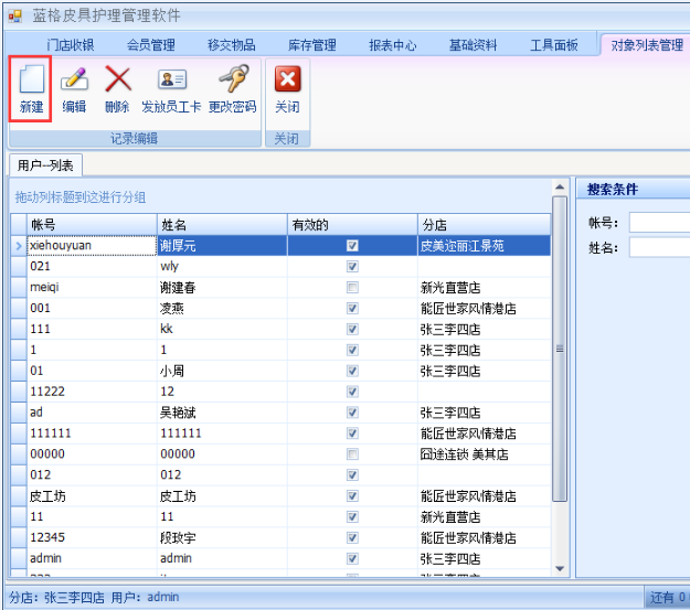 4、界面保存后,退出到傲藍(lán)皮具店連鎖管理軟件用戶列表界面,點(diǎn)擊搜索,就可以看到剛才添加的用戶了。