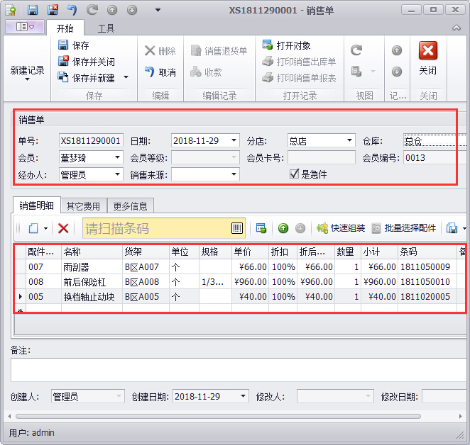 傲藍汽車配件零售系統銷售開單主要針對固定的客戶,銷售明細是對銷售汽車配件的詳細信息,用戶只要選擇汽車配件編號下拉列表即可,其它與配件相關的信息會自動填寫,用戶只要修改數量,其它費用的收入可以記錄在其它費用模塊中,點擊保存制作一張銷售單完成。