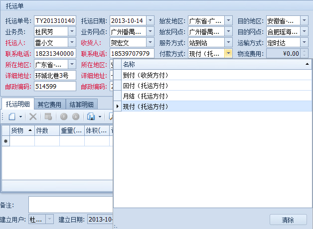 (傲藍(lán)物流軟件-新建托運(yùn)單詳細(xì)界面)