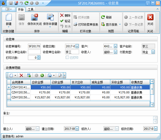 舞臺租賃軟件結算管理-收款單的具體屬性包括:編號、收款日期、客戶、收款人單位名稱、付款人單位名稱、收款人、付款類型、備注、收費單明細等屬性。