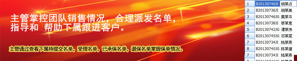 - 主管通過查看下屬待提交名單、受理名單、已承保名單或退保名單可了解保單的情況,通過查看救援卡名單可了解救援卡進(jìn)度;