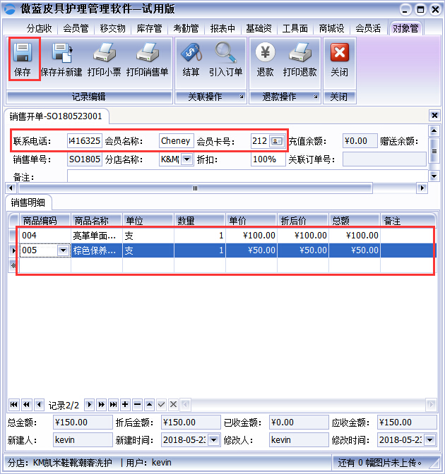 3、當(dāng)商品要進(jìn)行銷售時,在傲藍(lán)皮具護(hù)理店管理系統(tǒng)的【分店收銀】→【銷售開單】進(jìn)行銷售產(chǎn)品,填入會員或散客的電話,選擇需要銷售的產(chǎn)品,購買的數(shù)量保存,結(jié)算并打印收銀單據(jù)即可,如圖: